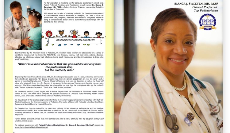 She has been improving the lives of the children since 2000 and provides quality care in a safe, welcoming environment her patients appreciate. “Dr. Bianca Sweeten has been my family’s pediatrician for over 15 years,” said a parent at www.Healthgrades.com. “I have a 15-year-old son and a 10 year old daughter, as well as my 9- year -old niece who absolutely love her. Dr. Sweeten is transparent in her care and has awesome bedside manners as a provider. What I love most about her is that she gives advice not only from the professional side, but the motherly side,” further explained the patient. “That’s what I look for in a physician.”